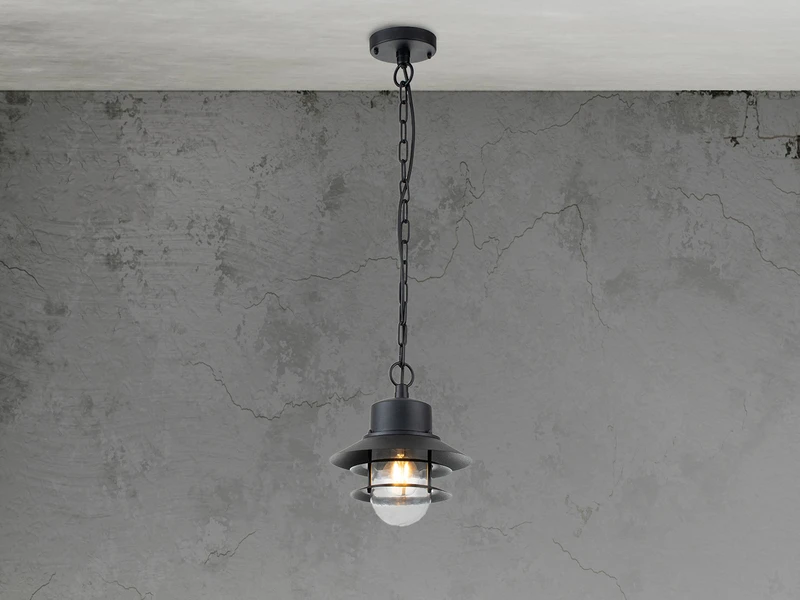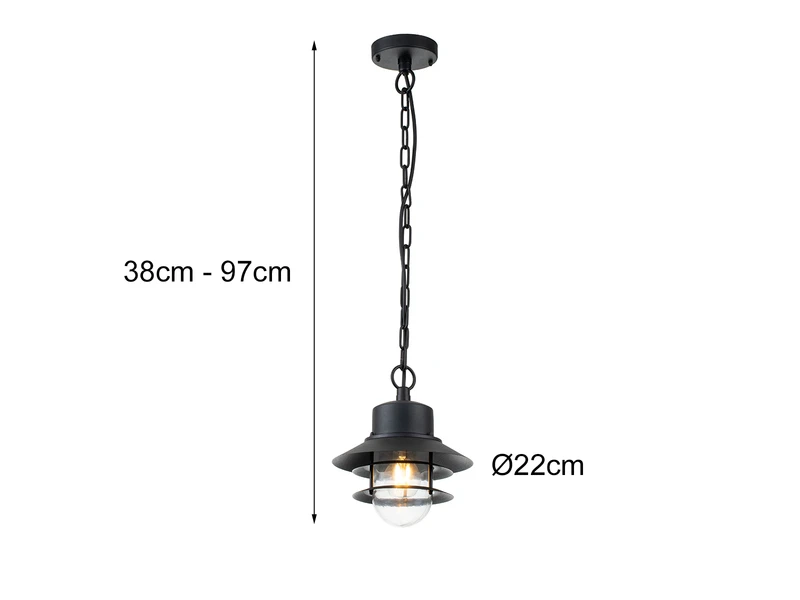 Gefertigt ist die hängende Außenlaterne aus Edelstahl 304 in schwarz, welches zusätzlich pulverbeschichtet wurde, um der Leuchte zusätzliche Haltbarkeit zu verleihen. Somit ist sie robust genug um rauen Umgebungsbedingungen standzuhalten, und eignet sich daher hervorragend für den Einsatz in Küstengebieten. Der Lampenschirm besteht aus klarem Glas. Zudem lässt sie sich in der Höhe von 38 bis 97cm einstellen.
