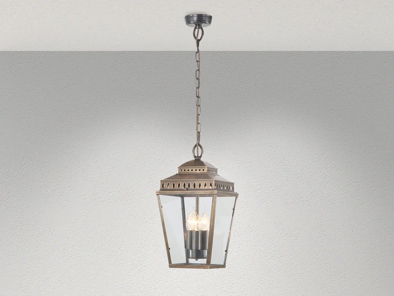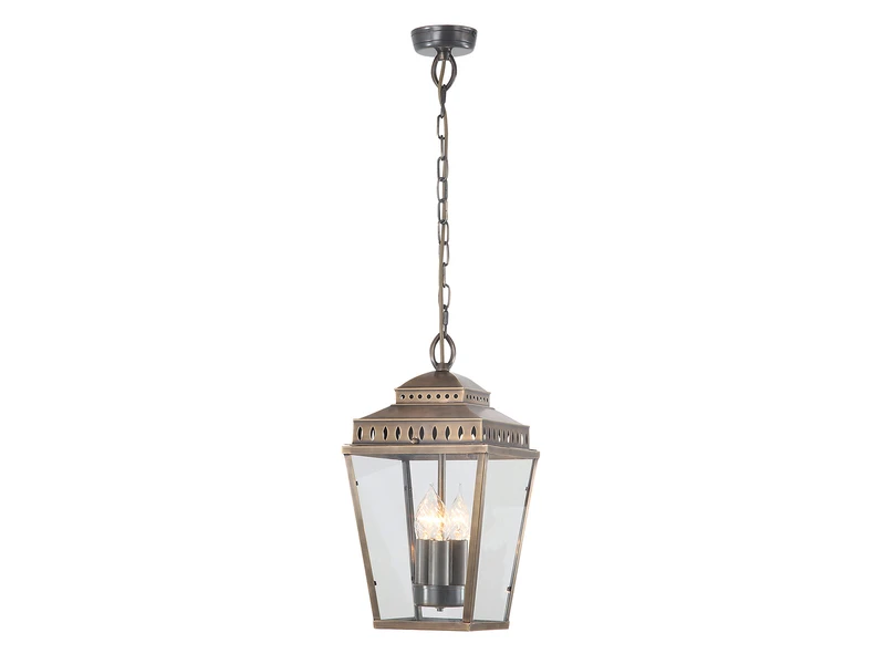 Die handgefertigte Outdoor Pendelleuchte mit dem Durchmesser von Ø22cm besteht aus hochwertigem, massivem Altmessing, welches für eine lange Lebensdauer lackiert wurde. Der Lampenschirm besteht aus klarem Glas. Mit ihrer widerstandsfähigen Konstruktion trotzt sie Wind und Wetter und spendet zuverlässig Licht.