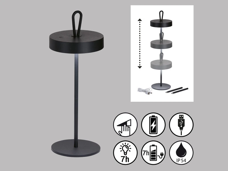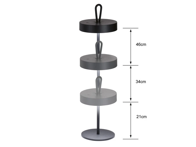 Mit dieser kabellosen Tischlampe bist du nicht nur unabhängig von Steckdosen, sondern kannst auch die Höhe der Leuchte deinen individuellen Bedürfnissen anpassen. Dank der ineinander steckbaren Rohre kann die Outdoor Lampe aus robustem, schwarzem Metall mit 21cm, 34cm oder 46cm aufgebaut werden, ganz nach persönlichem Geschmack.