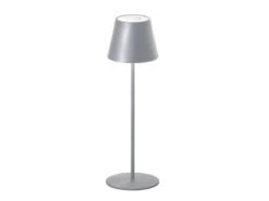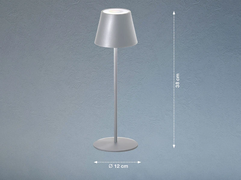 Die silberfarbene Tischlampe ist mit Schutzart IP44 ausgestattet und sowohl für den Innen- als auch für den Außenbereich perfekt geeignet. Mit einem Fußdurchmesser von 12 cm und einer Gesamhöhe von 38 cm ist sie handlich, aber dennoch nicht zu klein.