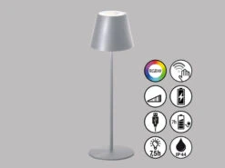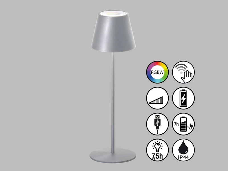 Die kabellose Tischlampe verfügt über einen Akku und hat eine Leuchtdauer von etwa 7,5 Stunden. Über den USB Anschluss kann sie mit dem mitgelieferten USB Kabel wieder aufgeladen werden (Ladezeit ca. 7 Stunden). Die fest verbauten LED Module sorgen mit einer Leistung von 2 Watt und 270 Lumen in Warmweiß sowie dem 1 Watt RGB Modul für eine gemütliche Beleuchtung.