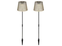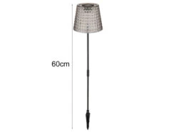 Diese 60cm hohen Erdspießleuchten bestehen aus Kunststoff in Schwarz und haben einen rauchfarbigen Kristall Lampenschirm, in dessen Inneren sich ein fest verbautes LED mit einer Leistung von je 0,06 Watt und 3.000 Kelvin in warmweiß befindet, das für schöne Lichteffekte sorgt. Der inkludierte AA NiMh Akku lädt sich bei Sonnenlicht auf und ist austauschbar.