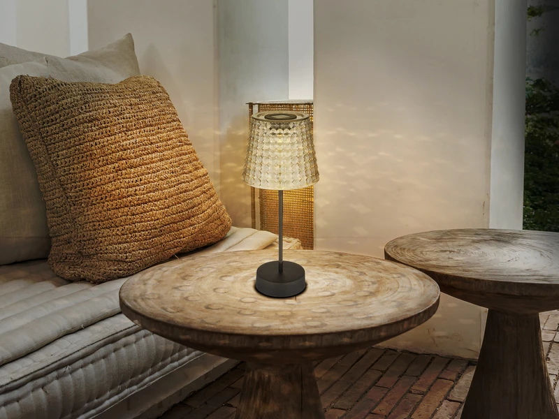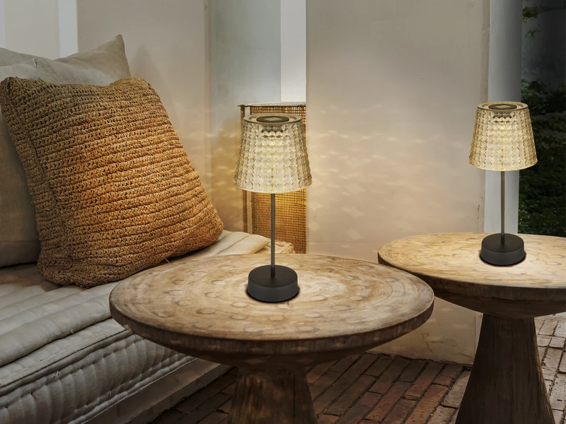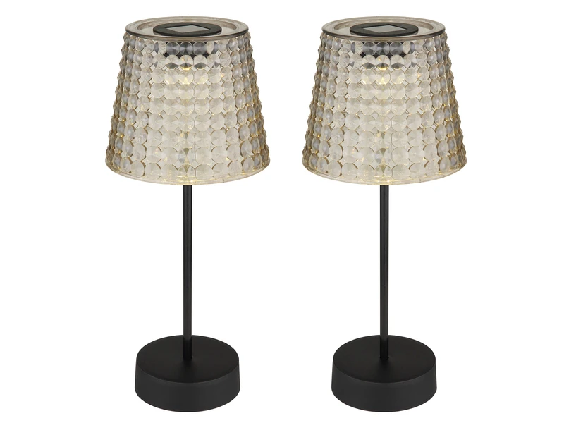 Diese 29cm hohen Outdoor Tischleuchten bestehen aus Kunststoff in Schwarz und haben einen rauchfarbigen Kristall Lampenschirm, in dessen Inneren sich ein fest verbautes LED mit einer Leistung von je 0,06 Watt und 3.000 Kelvin in warmweiß befindet, das für schöne Lichteffekte sorgt. Der inkludierte AA NiMh Akku lädt sich bei Sonnenlicht auf und ist austauschbar.