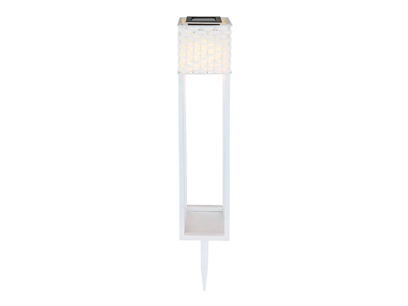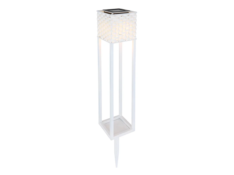 Durch dem eckigem Metallgestell und der mit weißem Rattan überzogener Oberseite, ist diese Erdspießleuchte alles andere als gewöhnlich.