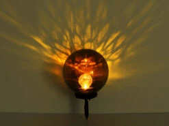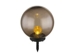 Diese ausgefallene Solarkugel besteht aus einer amberfarbigen Glaskugel, die von einer rauchfarbigen Kugel aus Kunststoff umhüllt ist.