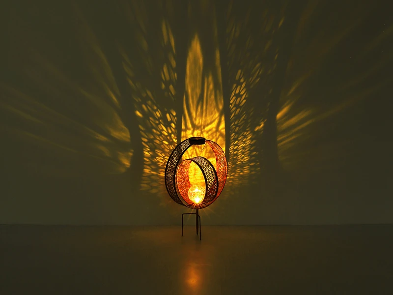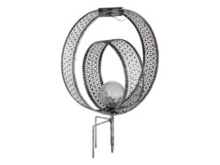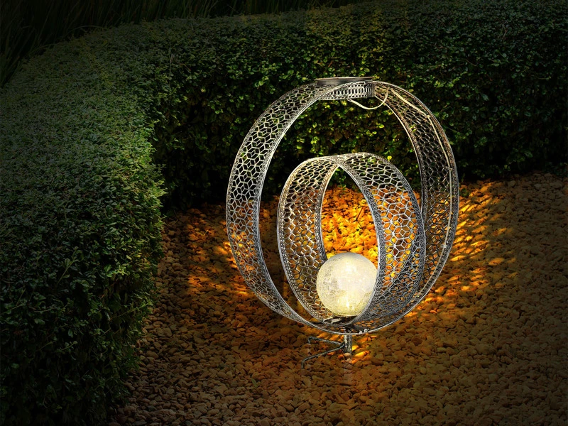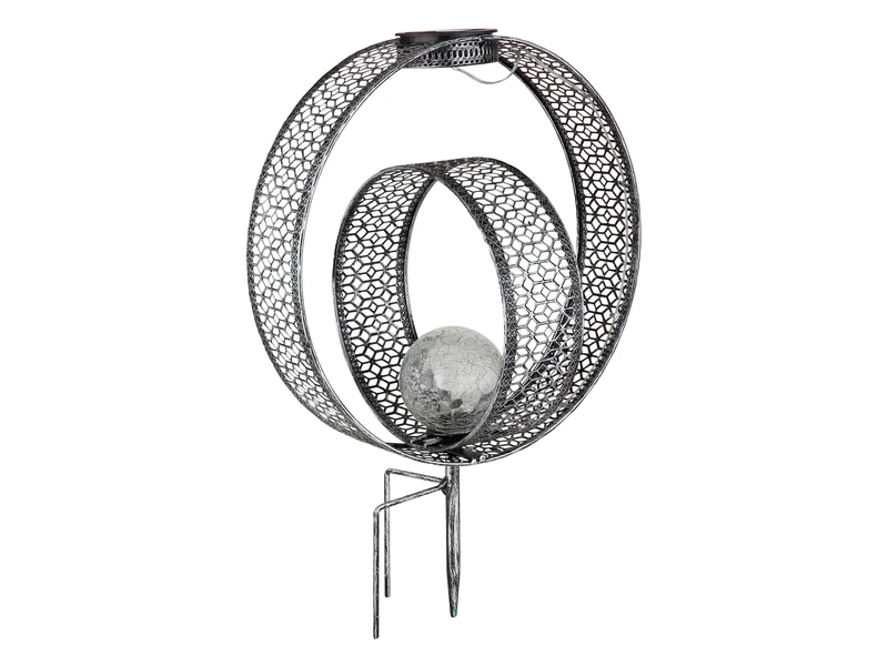 Diese 42cm hohe Solarleuchte ist ein echtes Dekoelement für Ihren Außenbereich. Sie besteht aus zwei Ringen aus Metall in antikem Silber und ist mit schönen Dekorstanzungen und einer klaren Glaskugel in Bruchoptik versehen, der innere kleine Metallring ist drehbar. Die Solarlampe ist mit einem LED-Leuchtmittel mit 0,06 Watt ausgestattet, welches ein 2.700 Kelvin warmweißes Licht ausstrahlt und somit für schöne Lichtspiele in Ihrem Außenbereich sorgt.