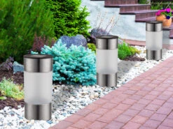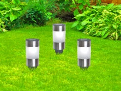 Die Gartenleuchten sind aus satiniertem Edelstahl gefertigt und bieten die Schutzart IP44 an. Somit sind die Solarlampen spritzwassergeschützt und für den Garten und Außenbereich ideal geeignet.