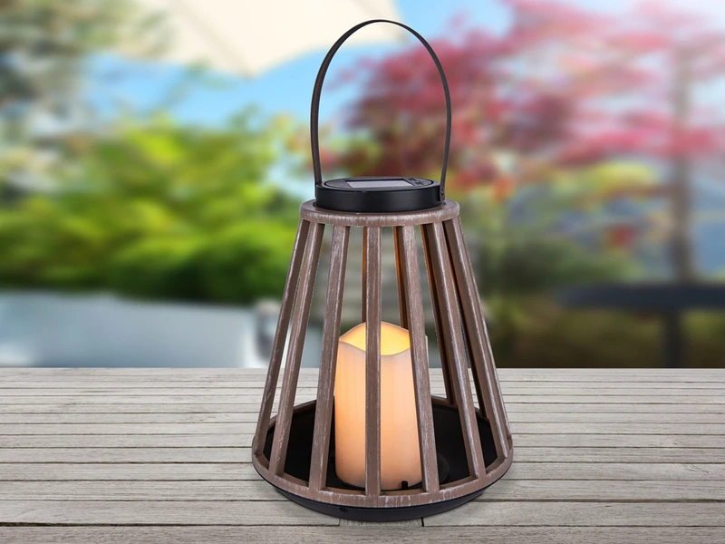 Diese ausgefallene Solarleuchte begeistert durch Ihr schönes Design. In einem Käfig mit Holzoptik (Ø20cm) befindet sich eine weiße LED-Kerze, welche ein 3200 Kelvin warmes Licht ausstrahlt und somit für faszienierende Lichtspiele und eine angenehme Atmosphäre sorgt.