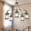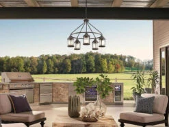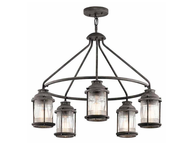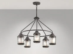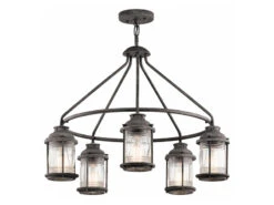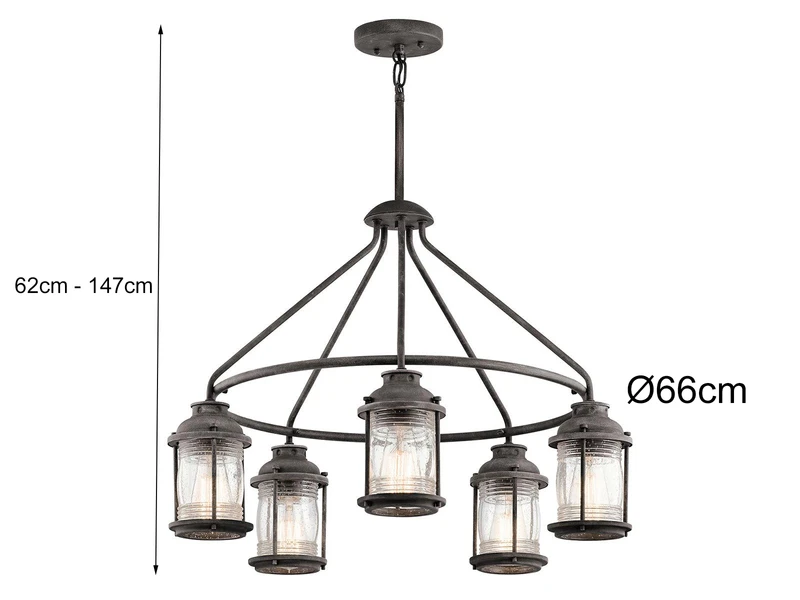 Diese Außenleuchte im Industrial Style besticht durch ihr rustikales Design und ihre hochwertige Verarbeitung. Der Korpus der Leuchte besteht aus anthrazit farbigem Stahl, die 5 einzelnen Lampenschirme aus strukturiertem Glas. Zudem hat sie einen Durchmesser von 66cm und sie kann in der Höhe von 62 bis 147cm eingestellt werden.