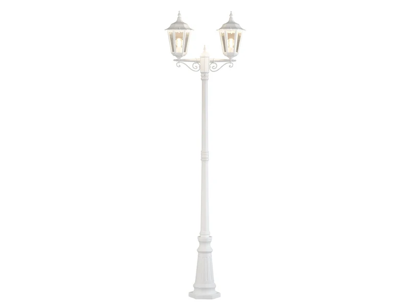 Die Gartenlaterne besteht aus matt-weiß lackiertem Aluminium und klarem Glas. Sie wird inkl. Pfahl und Befestigungsstange für Fundament geliefert. Der Standfuß hat einen Durchmesser von ca. 26 cm.