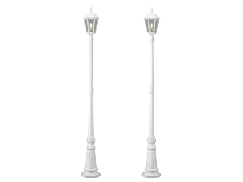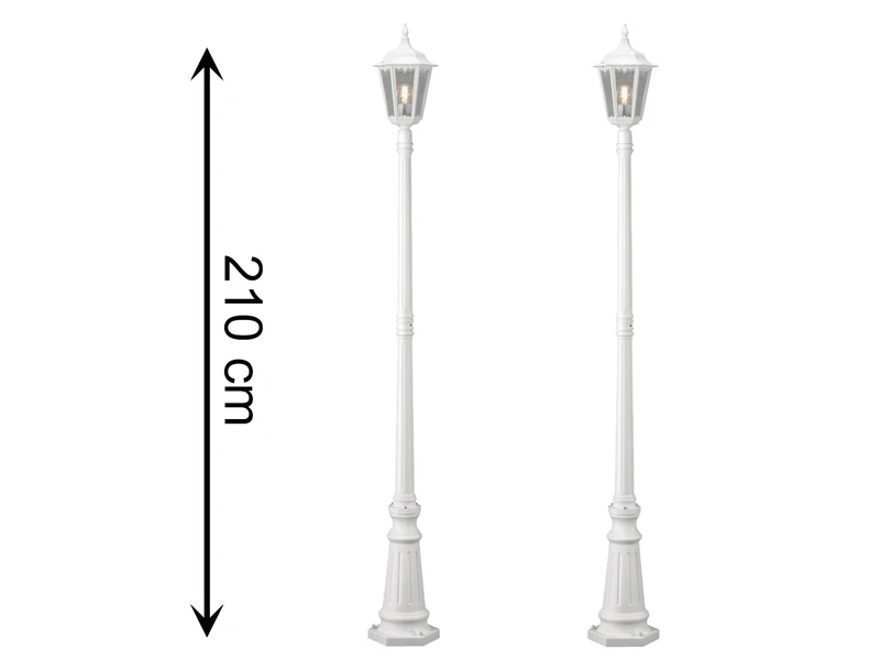 Jede Gartenlaterne besteht aus matt-weiß lackiertem Aluminium und klarem Glas. Sie werden inkl. Pfahl und Befestigungsstange für Fundament geliefert. Der Standfuß hat einen Durchmesser von ca. 26 cm.