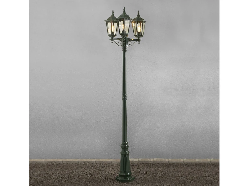 Die Mastleuchten bestehen aus grün lackiertem Aluminium und klarem Glas. Sie werden inkl. Pfahl und Befestigungsstange für Fundament geliefert. Der Standfuß hat einen Durchmesser von ca. 26 cm.
