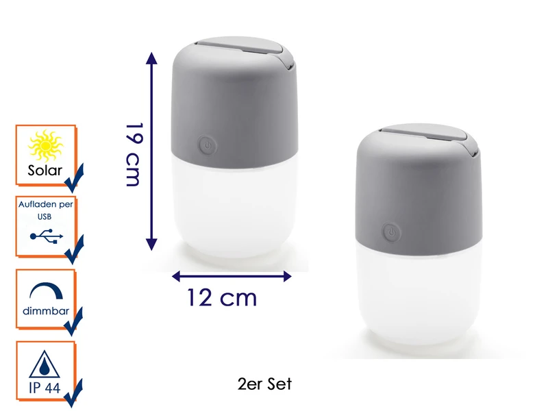 Allein im Hellen sind die Solarlampen mit ihrem grauem Kunststoffgehäuse und dem opalen Acrylglas schon ein toller Blickfang. Da die Leuchte ohne Kabel auskommt, können Sie diese Gartenlampe überall als Tischleuchte auf der Terrasse und im Garten nutzen oder sie aufhängen, um besondere Lichtpunkte zu schaffen. Als besonderes Highlight lässt sich die Solarlampe in drei Stufen dimmen. So können Sie zwischen einer guten Ausleuchtung z.B. beim Essen, bis hin zu einem dezenten Orientierungslicht wählen.