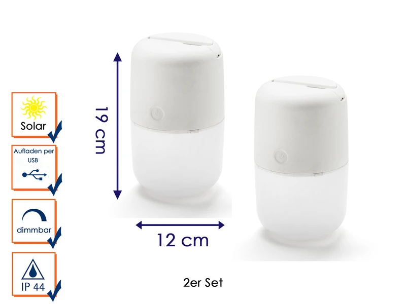 Allein im Hellen sind die Solarlampen mit ihrem weißem Kunststoffgehäuse und dem opalen Acrylglas schon ein toller Blickfang. Da die Leuchten ohne Kabel auskommen, können Sie diese Gartenlampen als Tischleuchte auf der Terrasse und im Garten nutzen oder sie aufhängen um besondere Lichtpunkte zu schaffen. Als besonderes Highlight lässt sich die Solarlampe in drei Stufen dimmen. So können Sie zwischen einer guten Ausleuchtung z.B. beim Essen, bis hin zu einem dezenten Orientierungslicht wählen.