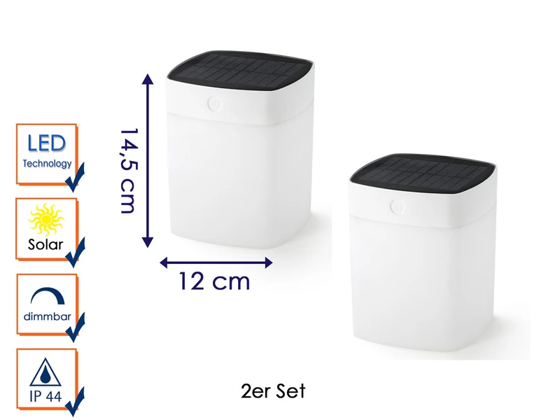 Allein im Hellen sind die Solarlampen mit ihrem weißem Kunststoffgehäuse und dem opalen Acrylglas schon ein toller Blickfang. Da die Leuchten ohne Kabel auskommen, können Sie diese Gartenlampen als Tischleuchte auf der Terrasse und im Garten nutzen oder sie ins Beet stellen, um besondere Lichtpunkte zu schaffen. Als besonderes Highlight lässt sich die Solarlampe in drei Stufen dimmen. So können Sie zwischen einer guten Ausleuchtung z.B. beim Essen, bis hin zu einem dezenten Orientierungslicht wählen.