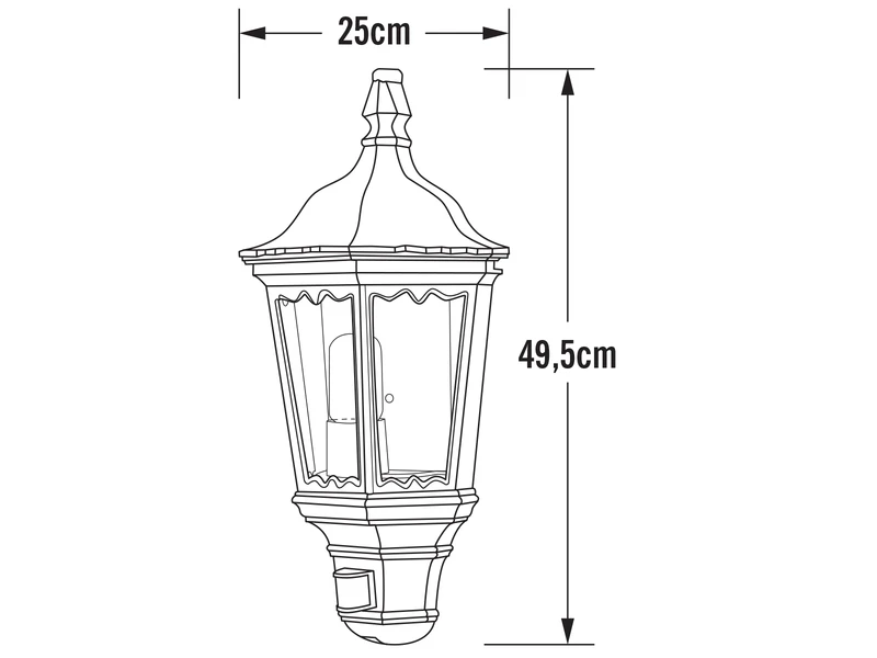 Die Außenwandleuchte hat eine Höhe von ca. 49,5 cm und eine Tiefe von nur 16 cm. Somit passt sich diese auch an schmale Stellen gut an.