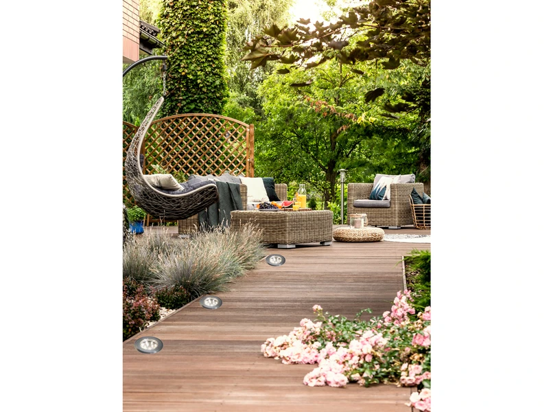 Die Mini Bodenspots sorgen fĂŒr eine stimmungsvolle AtmosphĂ€re in Ihren AuĂenanlagen. Durch die LichtbĂŒndelung nach oben können Sie GebĂ€ude oder Objekte in Ihrem Garten gezielt anstrahlen und so perfekt in Szene setzen. Mit einer Schutzart von IP44 können die Einbauspots fast ĂŒberall im AuĂenbereich und Innenraum platziert werden.