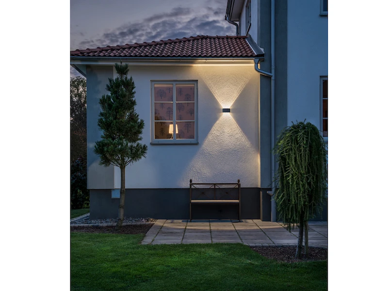 Mit ihrem abgerundeten Design sowie ihrem nach oben und unten gleichmĂ€Ăig gebĂŒndelten Licht wird die AuĂenleuchte schnell zum neuen Hingucker an Ihrer Hauswand oder in Ihrem Flur.