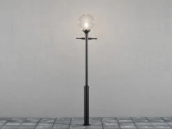 Gefertigt ist diese Mastleuchte, die von der Form her an eine nostalgische Straßenlaterne erinnert, aus klarem Acrylglas und schwarzem Aluminium. Je nach Leuchtmittel erhalten Sie hier eine sehr schöne Gartenbeleuchtung oder Straßenbeleuchtung.