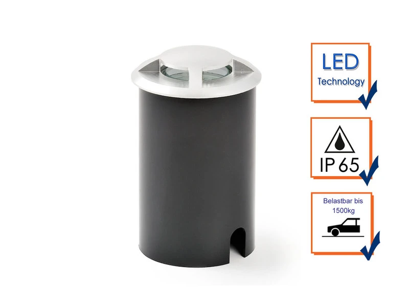 Aufgrund einer Belastbarkeit von 1500 kg ist dieser Bodeneinbaustrahler ideal für Ihre Einfahrt, Parkplatz oder Gartenwege.