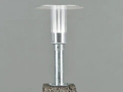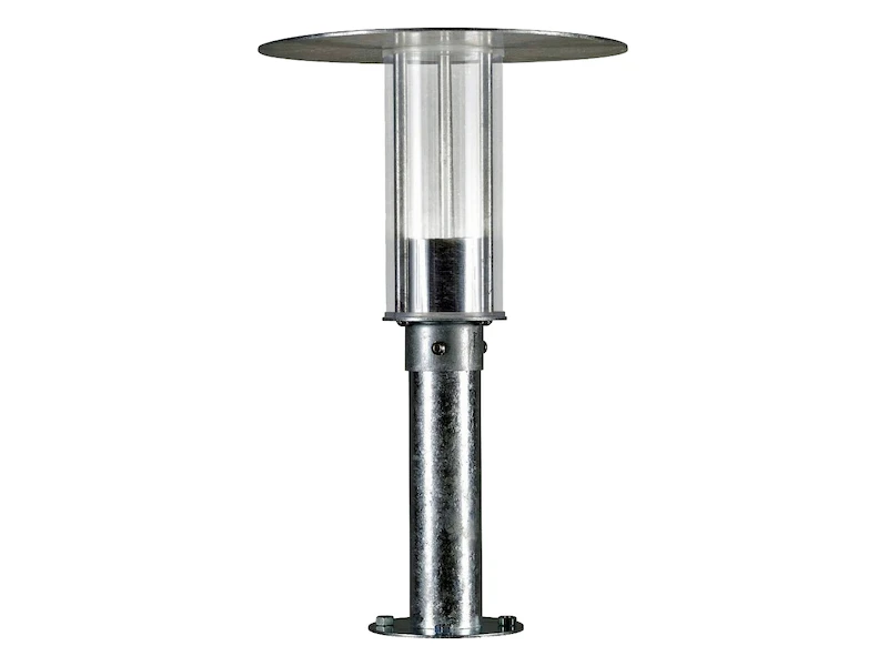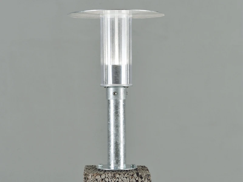 Der schlanke Glasschirm ist mit vier Schrauben an dem Standfuß befestigt, welcher wiederum mittels beigefügtem Sockel im Boden oder durch Schrauben auf einer Mauer gesichert wird.