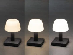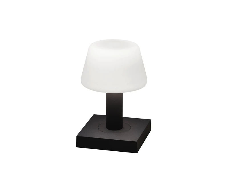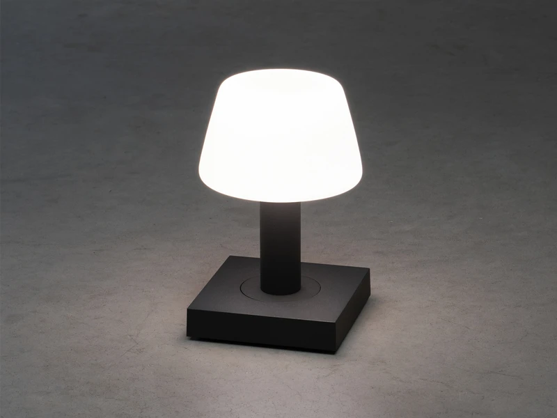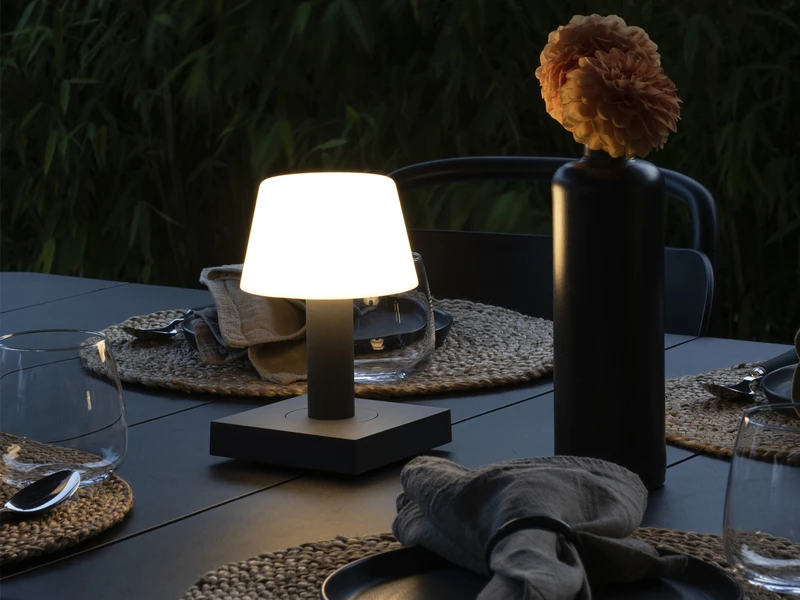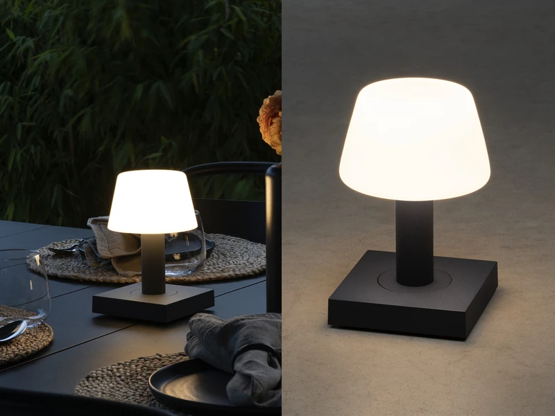 Die kleine Außentischleuchte aus Aluminium in Anthrazit vereint modernes Design und praktische Funktionen. Mit einer Höhe von nur 19 cm passt sie perfekt auf Ihren Terrassentisch, Ihre Veranda oder Ihren Balkon.