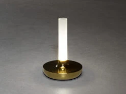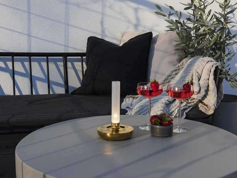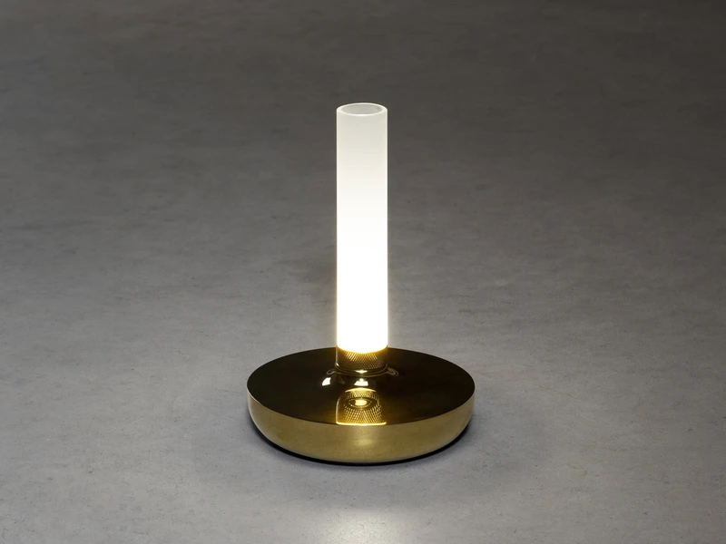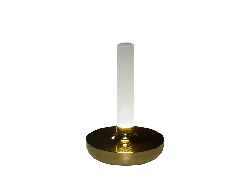 Der Leuchtenfuß der 20,5cm hohen Outdoor Tischleuchte besteht aus rostfreiem Stahl in Gold. Der röhrenförmige Lampenschirm aus gefrostetem Glas ist wasserdicht, sodass er mit Wasser befüllt – und als Vase genutzt werden kann.