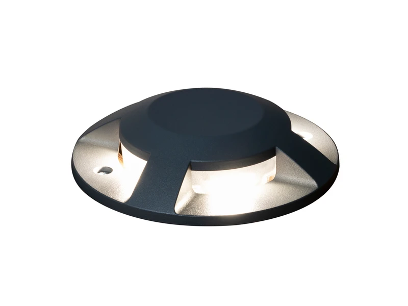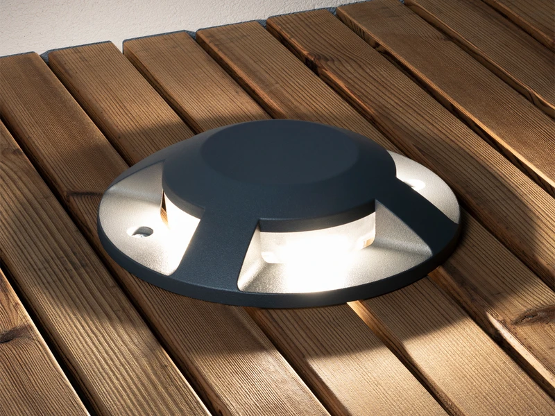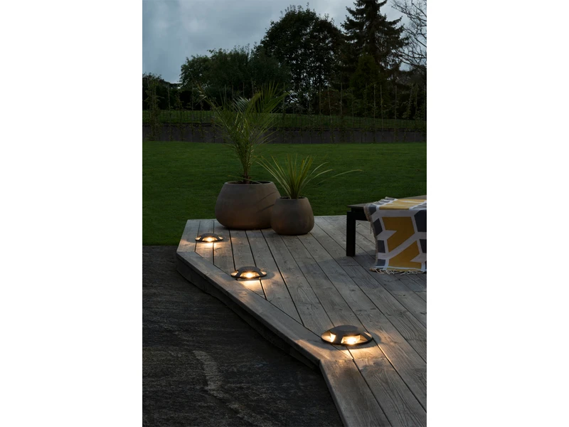 Der runde Bodenstrahler mit 20cm Duchmesser und 4,5cm Höhe erfüllt höchste Ansprüche an Technik, Funktionalität und Design. Der Lichtschein sorgt mit seinen 4 Lichtaustritten für eine sanfte Orientierung, damit man sich im Außenbereich auch nach Einbruch der Dunkelheit noch gut und sicher bewegen kann. Der Spot spendet zuverlässig Licht, wo Sie es benötigen ohne zu blenden.