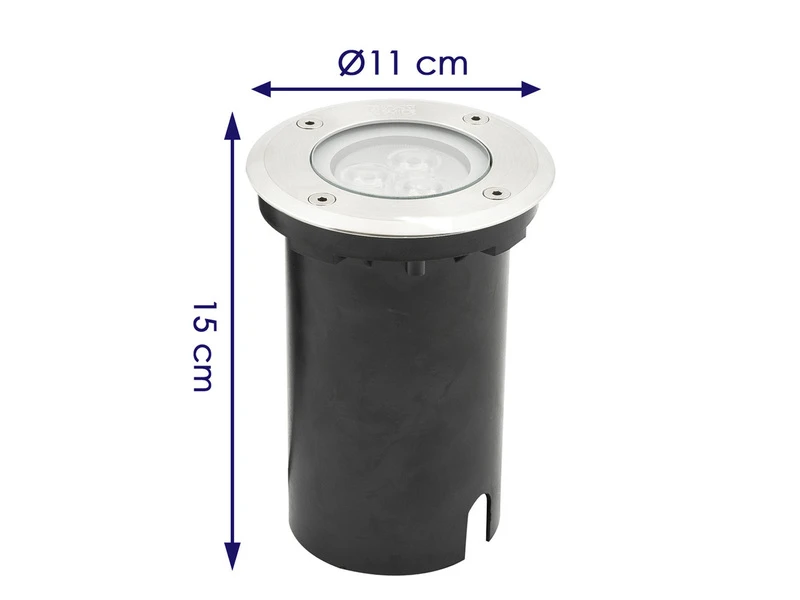 Der Bodeneinbaustrahler hat einen Durchmesser von 11 cm. Er enhält 3 fest verbaute, warm weiße High Power LEDs mit jeweils 1W und 250 Lumen. Er wird – neben den 4 Farbscheiben – inkl. Trafo 12V/6VA und 1m Anschlusskabel mit Stecker geliefert.
