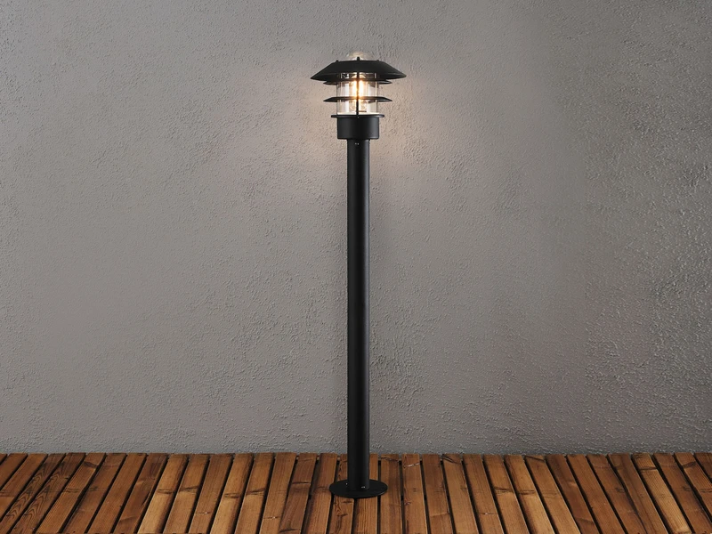 Gefertigt ist die 98cm hohe Außenleuchte aus Aluminium in der Farbgebung Schwarz und ist mit ihrer Schutzklasse IP23 für den Außenbereich geeignet.