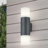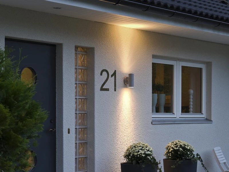 Durch den gebündelten Lichtaustritt nach oben und unten entstehen tolle Lichteffekte an Fassaden und Hauswänden.