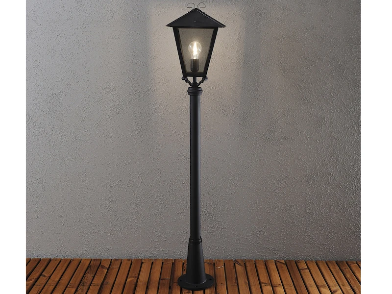 Die Standleuchte ist IP23 geschützt und die E27-Fassung nimmt Leuchtmittel bis 100 Watt auf, welche nicht mitgeliefert werden.