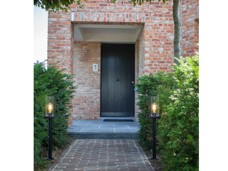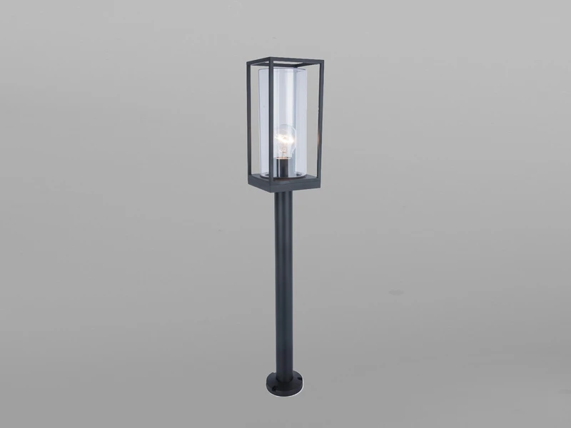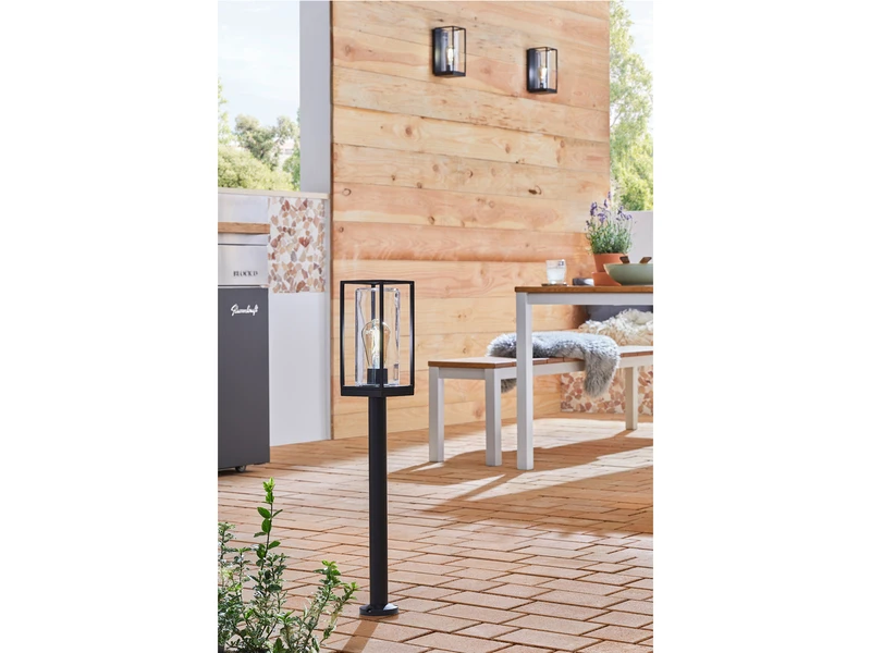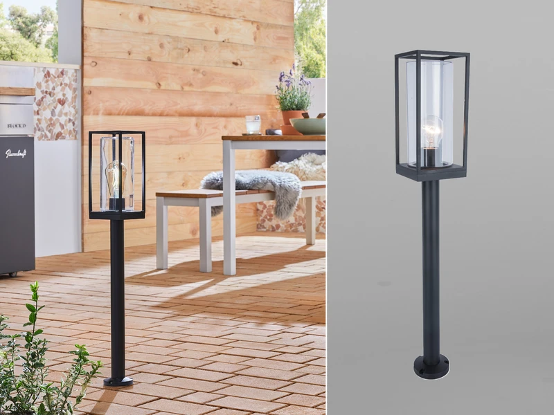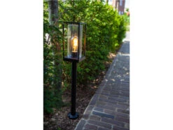 Beim Einschalten der Leuchte wird das Licht angenehmen an den Außenbereich abgegeben und sorgt für ein dekoratives Lichtambiente. Die rustikale Pollerleuchte ist aus Aluminiumguss gefertigt und setzt mit der Farbgebung in Schwarz, in Kombination mit dem transparenten Glas, gekonnte Akzente bei der Gartenbeleuchtung.