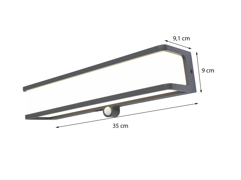 Bei einer Breite von 35cm und einer Höhe von 9cm hat sie eine Ausladung von nur 9,1cm. Durch die geschickte Lichtstreuung können Sie den gewĂŒnschten AuĂenbereich angenehm blendfrei ausleuchten und erhalten dabei einen schönen Lichteffekt.