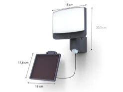 Die 18 cm breite Wandleuchte hat ein separates Solarmodul mit einem 5 Meter langen Kabel.