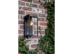 Die rustikale Wandlampe ist aus Aluminiumguss gefertigt und setzt mit der Farbgebung in Schwarz matt, in Kombination mit dem transparenten Glas, gekonnte Akzente an der Hauswand, die Schutzart IP44 unterstreicht die Witterungsbeständigkeit der eckigen Leuchte. Die Wandleuchte hat eine Höhe von 28,5cm und eine Breite von 12cmx 13,8cm.