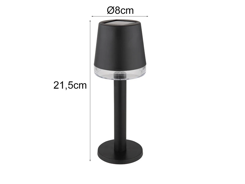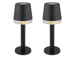 Diese 21,5cm hohen Außentischleuchten aus Kunststoff in Schwarz haben einen Lampenschirm, in dessen Inneren sich ein filigranes Filament LED mit einer Leistung von 0,5 Watt und 3.000 Kelvin in warmweiß befindet, das für schöne Lichteffekte sorgt. Der inkludierte AA NiMh Akku lädt sich bei Sonnenlicht auf und ist austauschbar.
