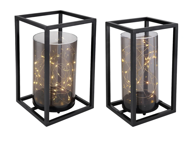 Diese Solar Dekoleuchten haben eine Höhe von 25 cm und 28cm und bestehen aus einem schwarzem Gestell aus Metall mit einem rauchfarbigem, zylinderförmigem Lampenschirm aus Acrylglas, in dessen Inneren sich eine kleine Lichtkette mit einer Leistung von 0,06 Watt und 3.000 Kelvin in warmweiĂ befindet, welche fĂŒr schöne Lichteffekte in Ihrem Outdoor Bereich sorgt.