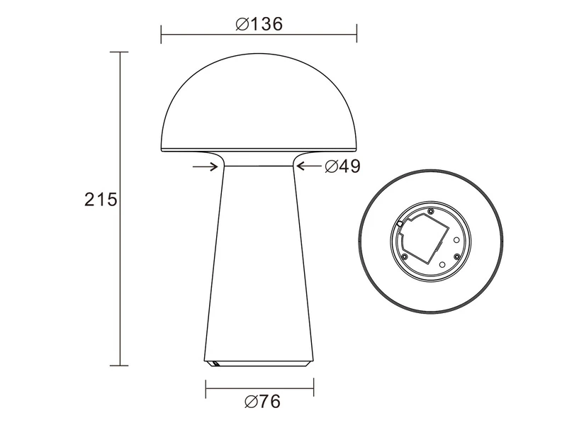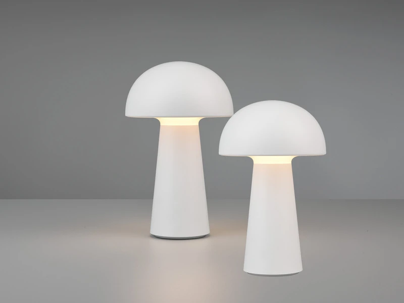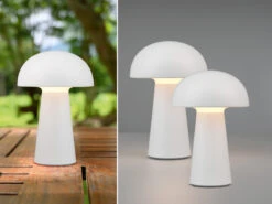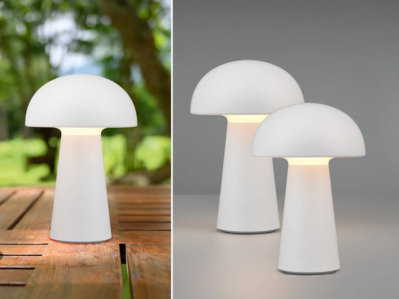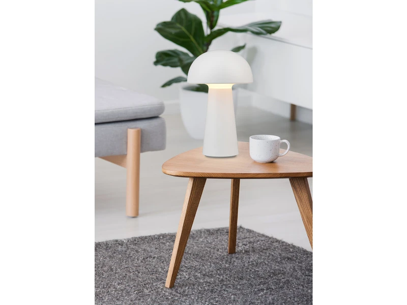 Durch die Klassifizierung IP44 ist die Leuchte vor Spritzwasser geschützt und damit auch für den Außenbereich geeignet. Durch das schlichte und reduzierte Design in Pilz Form, wird die weiße Tischleuchte zu einem unaufdringlichen Dekoelement das besonders anpassungsfähig ist.