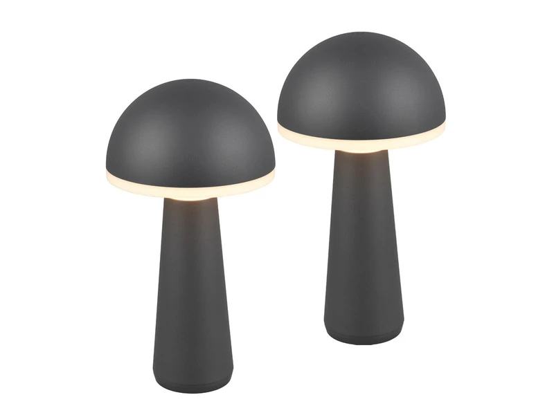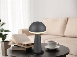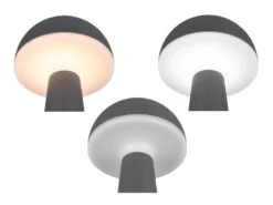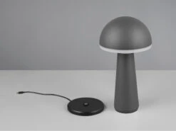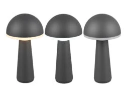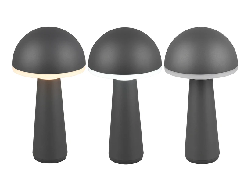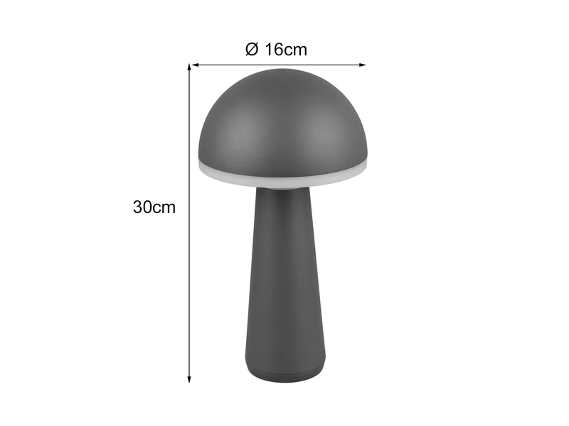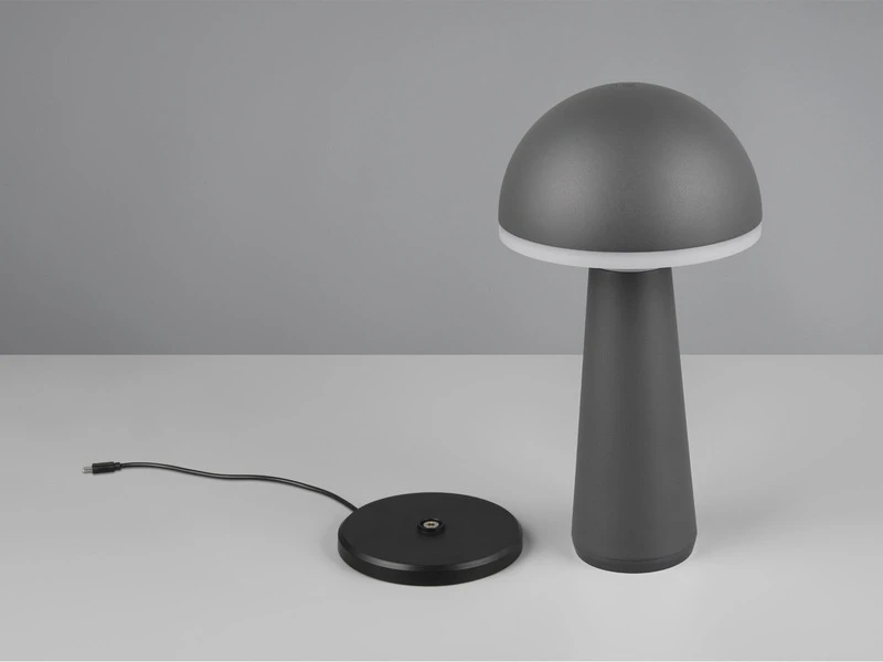 Die 30cm hohe Leuchte aus Druckguss Aluminium ist über die mitgelieferte Ladestation (Station mit USB Kabel) ganz einfach aufladbar und kommt überall dort zum Einsatz, wo ein Stromanschluss fehlt. Ihr charakterstarkes Pilzdesign und die zeitgemäße Farbe in Anthrazit machen die Tischleuchte zu einem auffälligen Dekorationselement.