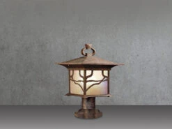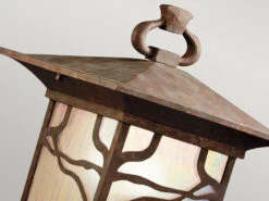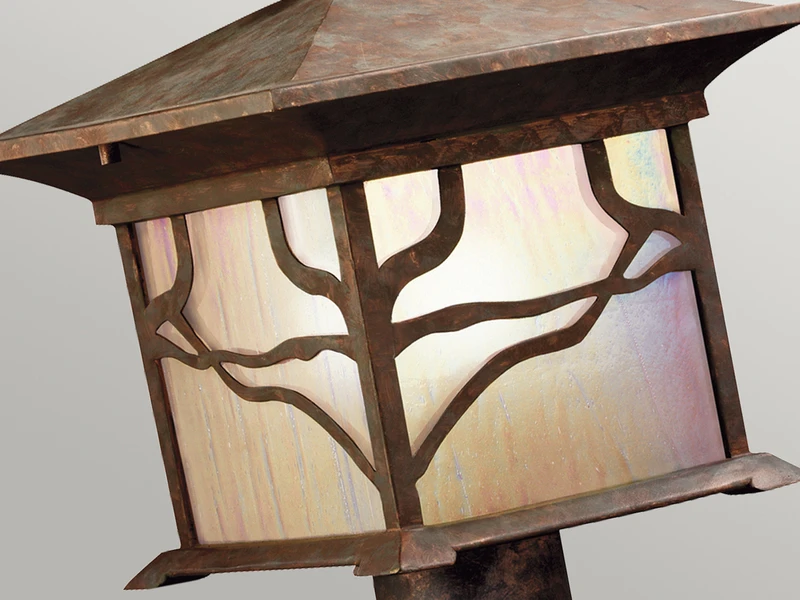 Der Korpus aus Aluminium mit Kupferfinish und einer leichten Patina-OberflÀche wird ergÀnzt durch den Lampenschirm aus geÀtztem Glas und verleiht ihr den antiken Laternenlook vergangener Zeiten.