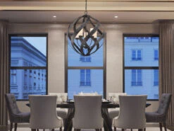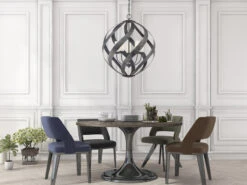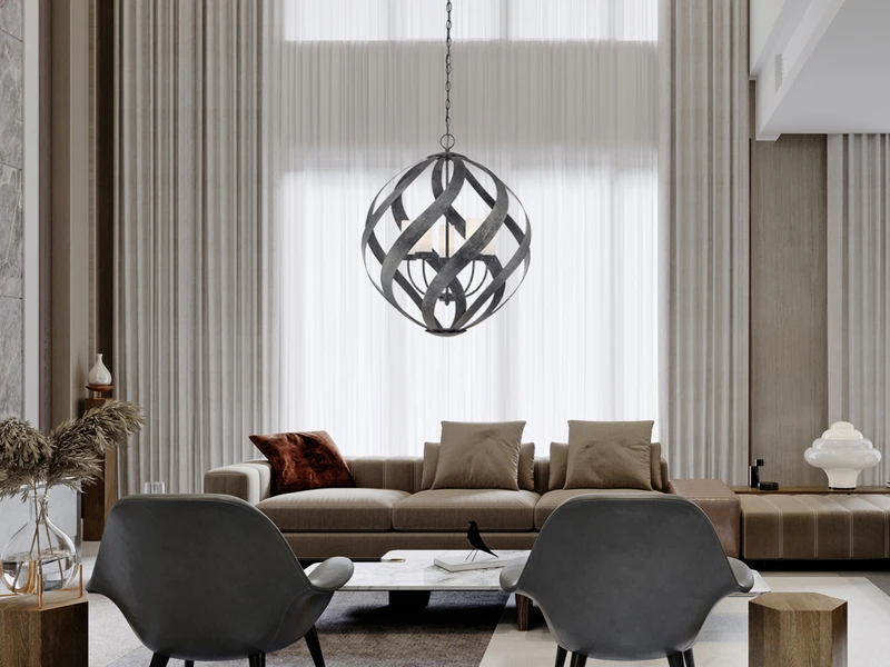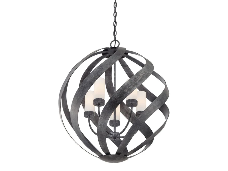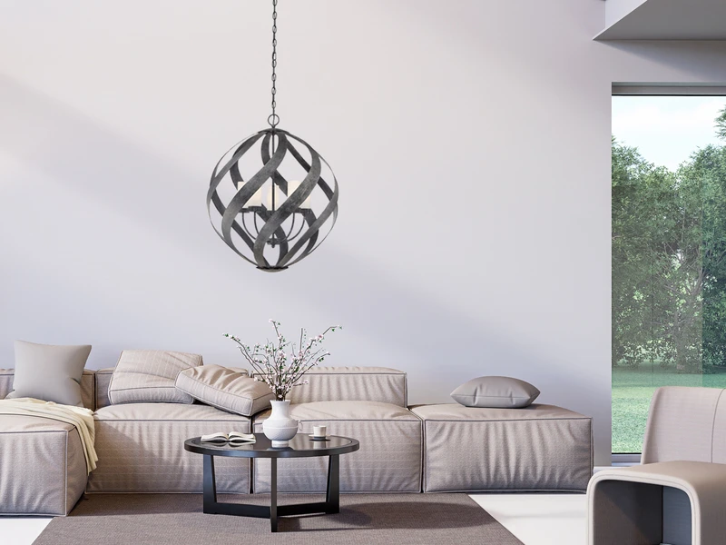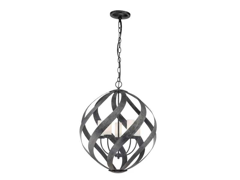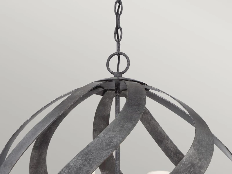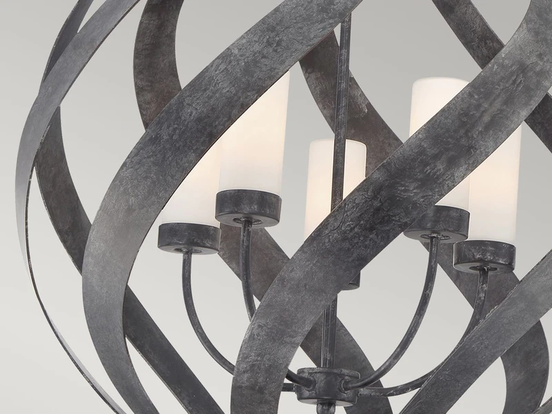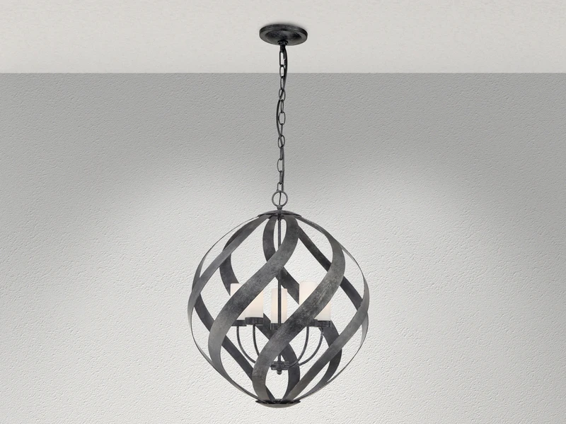 Der robuste Lampenschirm aus Stahl bewegt sich in weichen Kurven entlang einer kugelförmigen Silhouette. Die altschwarze Oberfläche enthält Akzente aus Holzkohle und dunklem Silber für einen schwülen, rauchähnlichen Effekt. Die Kerzen sind mit zylindrischen Schirmen aus mattiertem Glas ausgestattet, die das Licht dieser atemberaubenden Kollektion weicher machen.