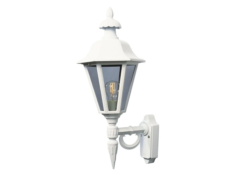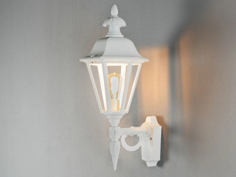 Der Korpus der stehenden Wandlaterne besteht aus weiß lackiertem Aluminium; der Lampenschirm aus klarem Acrylglas unterstreicht den Laternen Charakter der Leuchte.