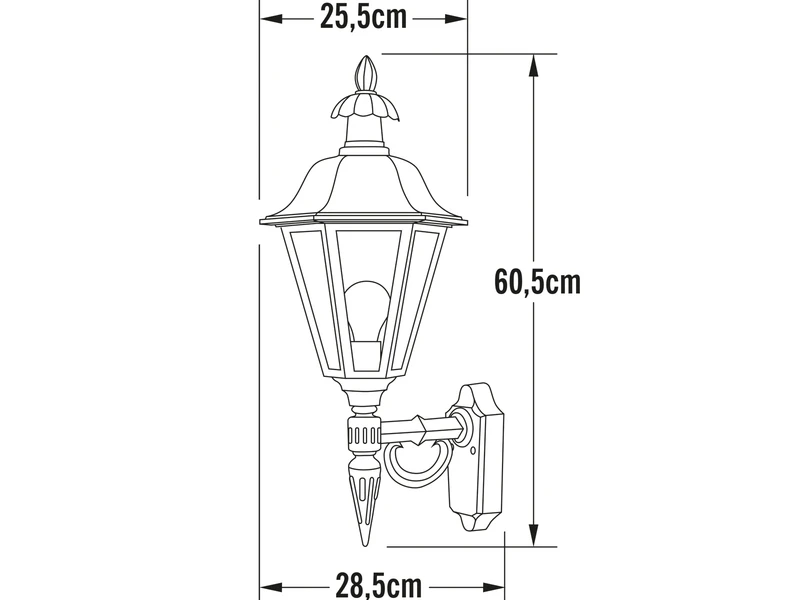 Die große Außenwandleuchte im Landhausstil hat eine Höhe von 61cm und bietet als Terrassenbeleuchtung, Balkon Beleuchtung oder im Eingangsbereich eine optimale Ausleuchtung. Sie ist 25,5cm tief und 28,5cm breit.