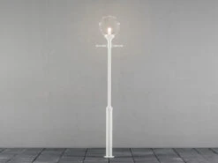 Gefertigt ist diese Mastleuchte, die von der Form her an eine nostalgische Straßenlaterne erinnert, aus klarem Acrylglas und mattweißem Aluminium. Je nach Leuchtmittel erhalten Sie hier eine sehr schöne Gartenbeleuchtung oder Straßenbeleuchtung.
