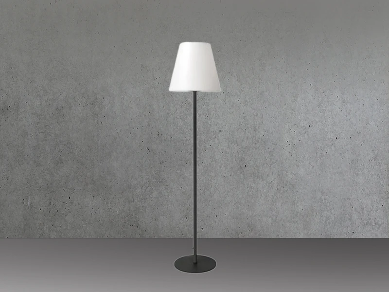 Die Stehlampe ist mit einer E27 Fassung ausgestattet und wird inklusive einem austauschbaren E27 LED Leuchtmittel mit einer Leistung von 6 Watt, 470 Lumen und 3000 Kelvin (Warmweiß) geliefert.
