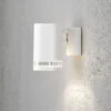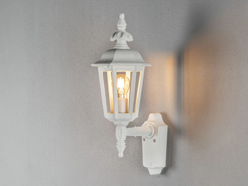 Der Korpus der stehenden Wandlaterne besteht aus weiß lackiertem Aluminium; der Lampenschirm aus klarem Acrylglas unterstreicht den Laternen Charakter der Leuchte.