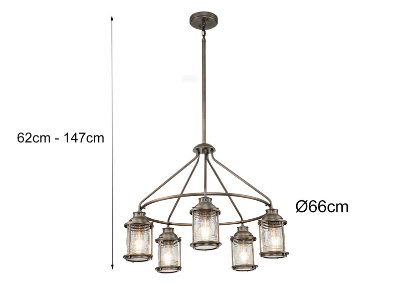 Diese Außenleuchte im Industrial Style besticht durch ihr rustikales Design und ihre hochwertige Verarbeitung. Der Korpus der Leuchte besteht aus bronze farbigem Stahl, die 5 einzelnen Lampenschirme aus strukturiertem Glas. Zudem hat sie einen Durchmesser von 66cm und sie kann in der Höhe von 62 bis 147cm eingestellt werden.