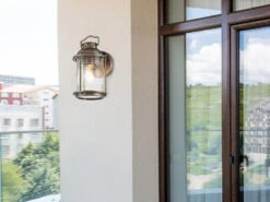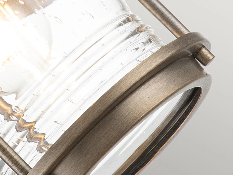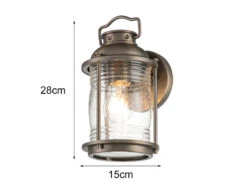 Diese Außenleuchte im Industrial Style besticht durch ihr rustikales Design und ihre hochwertige Verarbeitung. Der Korpus der Leuchte besteht aus bronze farbigem Stahl, der Lampenschirm aus strukturiertem Glas.