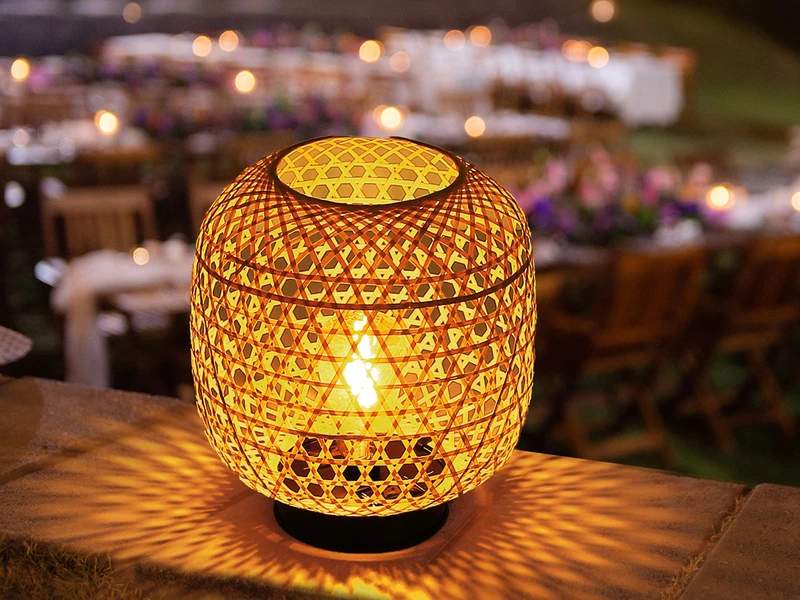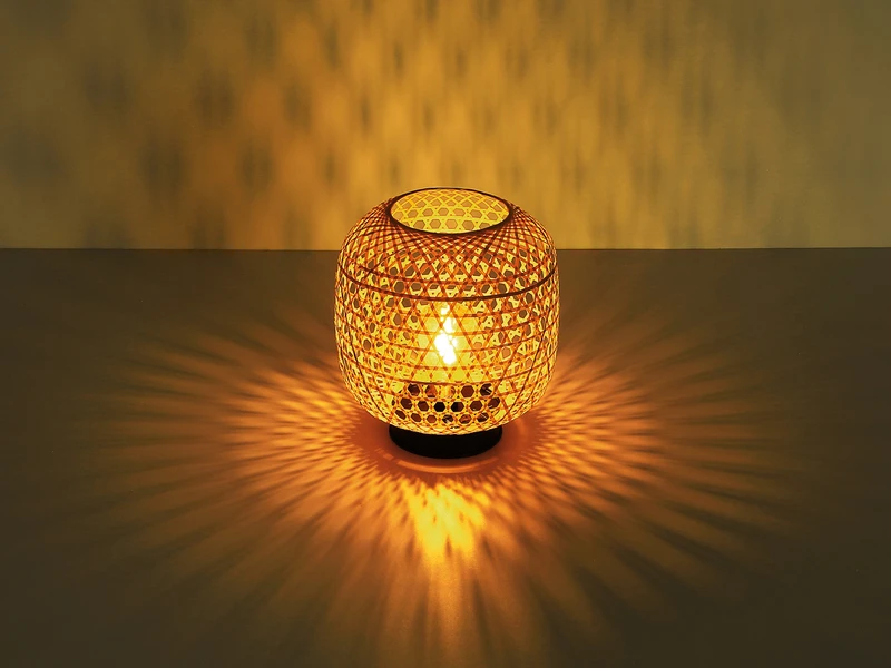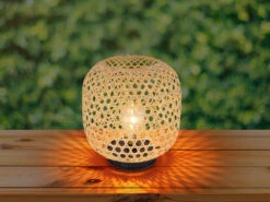 Dank der flachen Unterseite können die 27 cm groĂen Solarleuchten besonders gut auf Tischen oder FensterbĂ€nken platziert werden. Die ĂŒbereinander gezogenen Bambuselemente bilden ein stilvolles Muster, das durch das LED-Leuchtmittel auf der Innenseite, wunderschön projiziert wird. Diese runden Solarlampen aus Bambus sorgen fĂŒr eine stimmungsvolle AtmosphĂ€re in Ihrem Garten, auf der Terrasse oder dem Balkon.